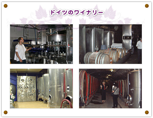※ 左上: このくらいの規模ですと50ヘクタールぐらいのぶどう畑の処理を行っています。 ※ 右上: 実験的に小さくいろいろな容器でワイン造りを試しているのがわかります。 ※ 左下: 20ヘクタールの葡萄を処理する能力があります。 ※ 右上: バッド・クロイツナッハの州営醸造所です。 次世代の醸造家の育成と